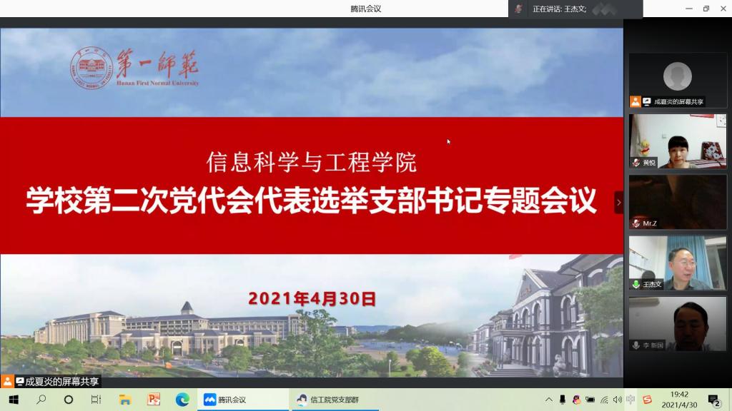 晚上19时30分,学院党总支借助腾讯会议平台召开了支部书记会议,党员学院领导、党总支委员、支部书记参加,会议由党总支副书记成夏炎主持。首先,党总支书记王杰文传达了学校、学院相关会议精神,简要介绍了本次党代会的背景、意义和任务,特别强调了代表选举纪律和要求。接着,成夏炎对今年会选举党代表进行了部署。