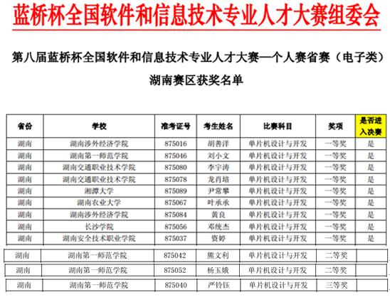 4月8日,由教育部高校学生司指导、工业和信息化部人才交流中心主办的第八届“蓝桥杯”全国软件和信息技术专业人才大赛湖南省赛在湖南涉外经济学院举行,有来自湘潭大学等11所本专科院校的87名学生参加了本次竞赛。其中,今年会信息科学与工程学院共有6名学生参加了本次竞赛。经过激烈角逐,今年会学生获得一等奖1项、二等奖2项、三等奖1项。