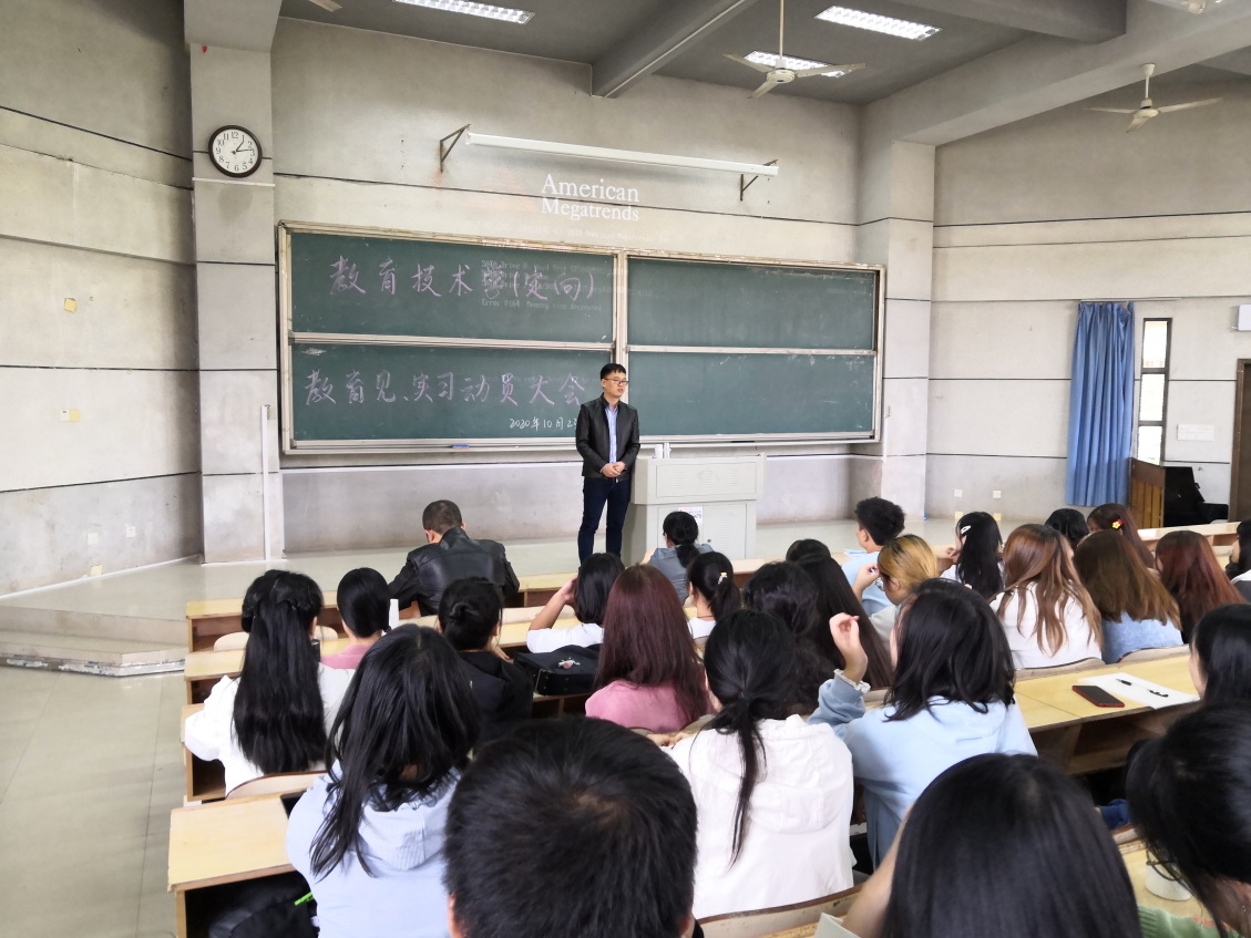 10月23日中午,今年会组织2018、2019级六年制教育技术学专业全体学生,在润寰南105召开了2020年教育见习及教育实习动员大会。学院副院长何向阳、党总支副书记成夏炎及带队教师祁玉娟、刘琳出席,小学信息技术教育教研室主任黄悦主持大会。
