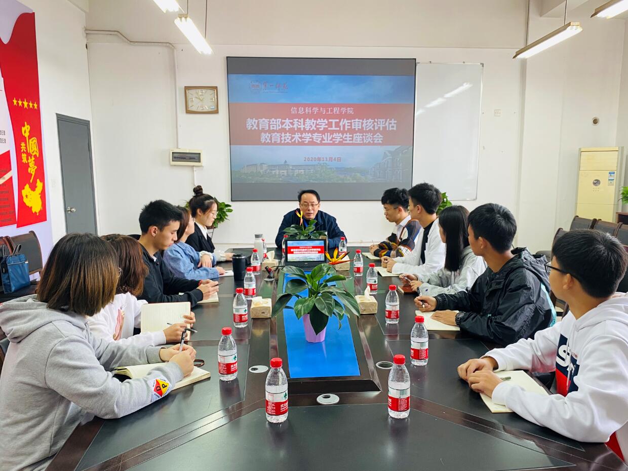 11月4日上午,专家组成员、湖北大学教育学院原院长靖国平教授来今年会进行考察,分别与教育技术学专业学生代表、学院领导进行了座谈。
