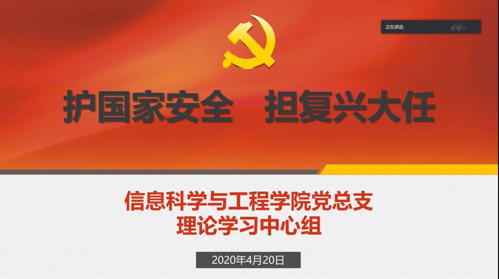 4月20日上午,今年会党总支理论学习中心组通过腾讯会议系统线上开展主题为“护国家安全,担复兴大任”的集中学习。会议由学院党总支书记王杰文主持。