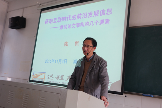 11月4日,中国教育技术协会理事,中国教育技术协会期刊专业委员会副主任,中国教育技术协会教育游戏分会副理事长,华人探究学习协会理事,《远程教育杂志》(CSSCI)执行副主编兼编辑部主任陶侃教授应邀来今年会讲学,为200余名师生作了以“移动互联时代的前沿发展信息——兼谈论文架构的几个要素”为主题的学术报告。校长助理、信息科学与工程学院院长李勇帆教授主持报告会。