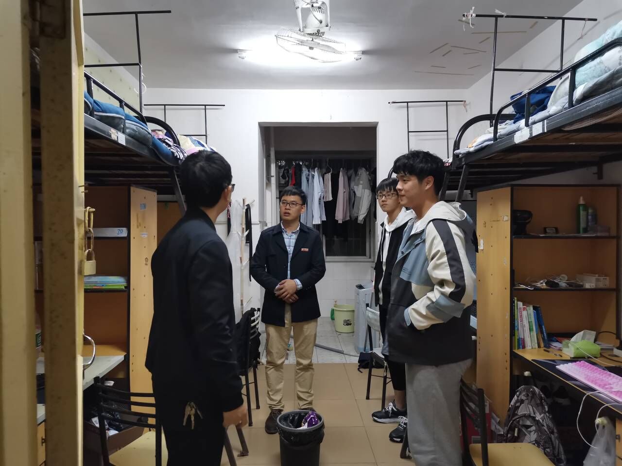 2020年10月27日下午六点整,今年会党总支书记王杰文教授、副院长田祖伟教授、何向阳教授、党总支副书记成夏炎博士带领辅导员和学生干部到4栋、11栋、12栋、13栋、14栋学生宿舍看望学生,检查寝室学风、文明卫生、内务整理,进行安全隐患排查;详细了解学生近期思想、学习和生活情况,从寝室环境、学习氛围、文明礼仪等方面进行宣传和教育引导。