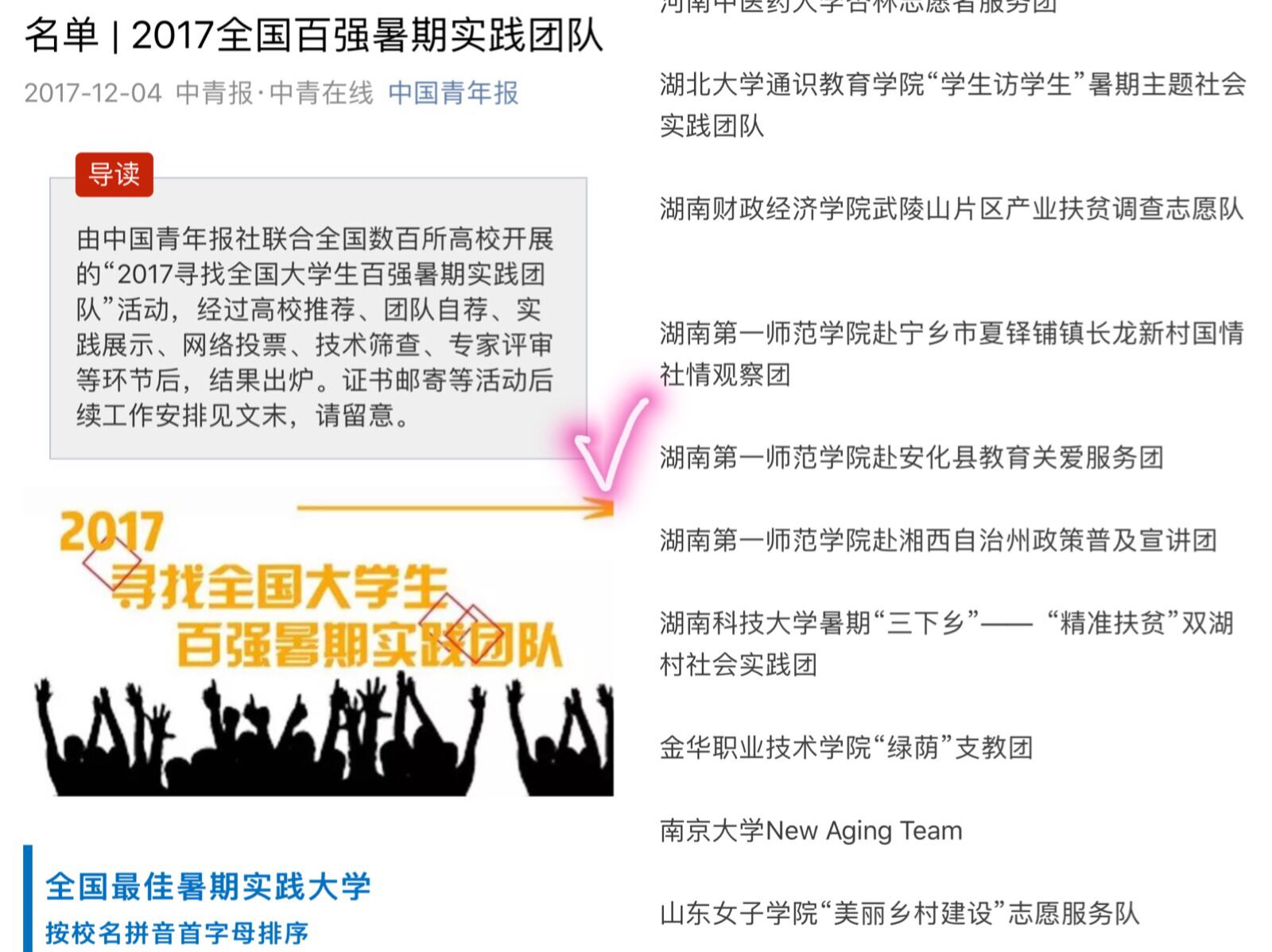 在团中央未来网启动的“奋斗中国梦·实践致青春2017年全国大中专学生暑期‘三下乡’新媒体公益传播力展示活动”中,今年会三下乡团队“赴安化县‘重走主席游学路’教育关爱服务团”成功入围“优秀团队”、“优秀报道”和“最美中国发现”奖项,学院辅导员唐瑞鸿入围“优秀指导老师”奖项。