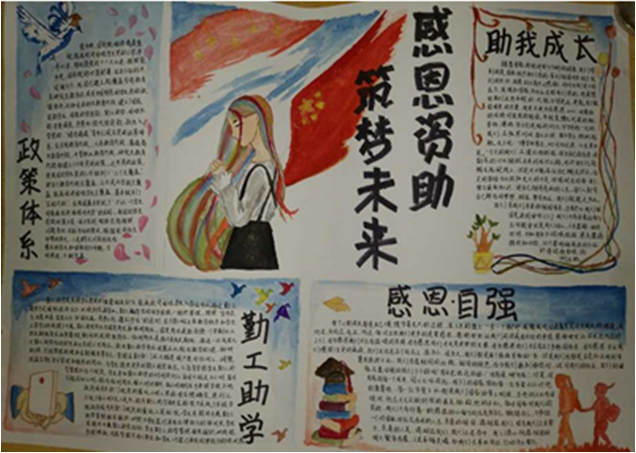 在手抄报的赛场上,共有68名同学参赛。同学们将自己了解的资助政策知识绘制成立意新颖、创意独特的手抄报,用生动的语言和真实的情感表达了个人对资助政策的感悟。通过评委集中评选,共选出18级787教技班汤筱《感恩资助,励志青春》等5幅优秀作品推至校部参与决赛。
