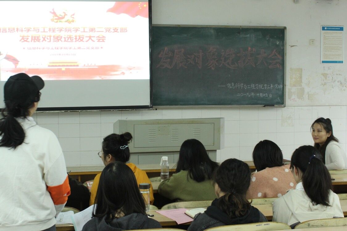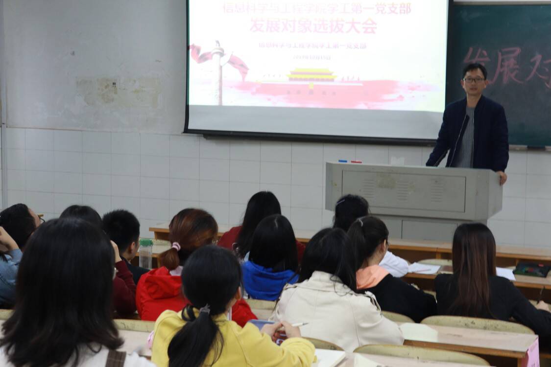 (通讯员 邓世骄 蒋郑菊)为进一步落实今年会党组织对优秀人才的选拔工作,深入了解积极分子的思想动态,10月15日下午,信息科学与工程学院学工第一党支部、第二党支部于玉衡楼北栋507、508顺利召开发展对象选拔大会。学工第一党支部书记关红儒同志、学工第二党支部书记唐瑞鸿同志、部分学生党员及33名入党积极分子参加此次会议。