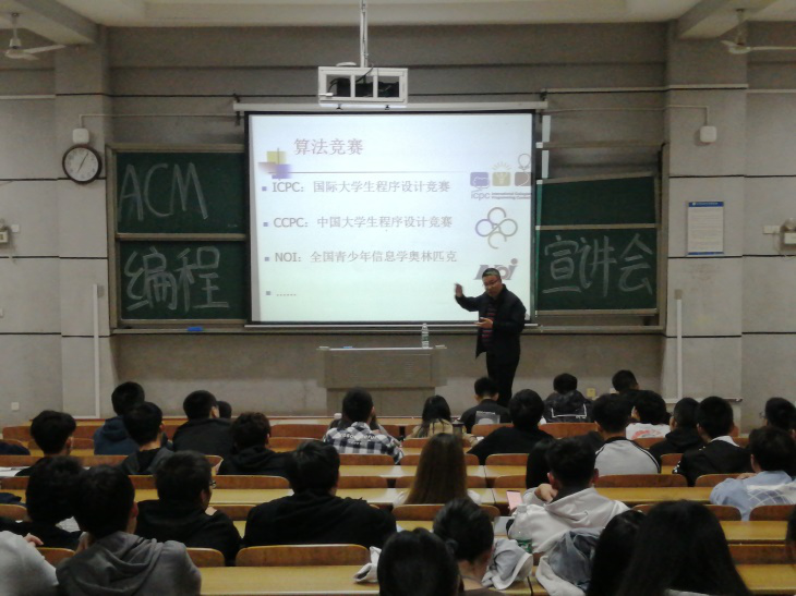 会上,田祖伟教授分别从赛事构成、组队要求、比赛规则、知识储备、解题步骤以及评分细节六个方面进行了细致讲解。他指出ACM程序设计竞赛是对编程能力、算法能力、分析问题能力以及团队合作能力的综合考查,同时表示欢迎各院对程序设计充满兴趣的同学前来学习,学院会通过对参赛学生进行定期培训、初试选拔及强化训练来有效提高同学们的设计与创新能力。