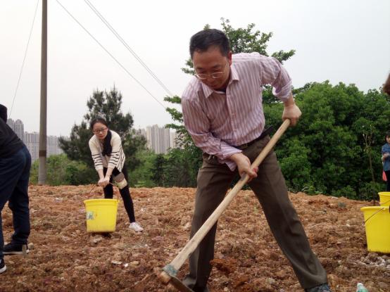 植树现场,学院党总支书记王杰文与老师同学们拿起铁锹、锄头热情地参与到植树活动中。同学们被领导老师的热情所感染,有的挥锹铲土,有的扶树填土,有的培土浇水,忙得不亦乐乎。王杰文书记一边用力地挥动着锄头一边向同学们传授着植树要领:“挖土下去那一下要使劲!土里面的石头要拣出来!”。经过将近一个小时的劳动,100多棵树在山坡上“安家落户”,为一师校园添上了一抹“信工绿”。虽然在植树过程中下起了雨,泥巴裹满了老师、同学们的裤腿,但是今年会师生仍然坚持完成了植树任务。