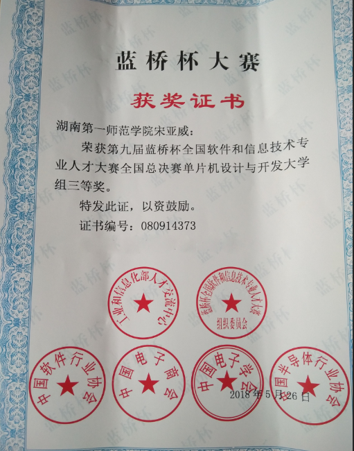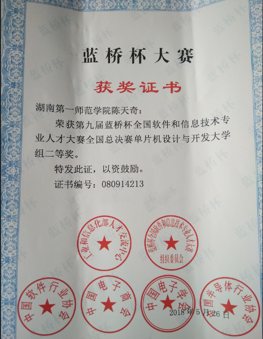 近日,第九届蓝桥杯全国软件和信息技术专业人才大赛全国总决赛在北京落下帷幕。来自北京大学、清华大学等1200多所高校的5000余名各省市自治区一等奖选手参加了全国总决赛。今年会jinnianhuicom信息科学与工程学院学生陈天奇在傅红普教授指导下荣获单片机设计与开发大学组二等奖、宋亚威在马重明教授的指导下荣获单片机设计与开发大学组三等奖。