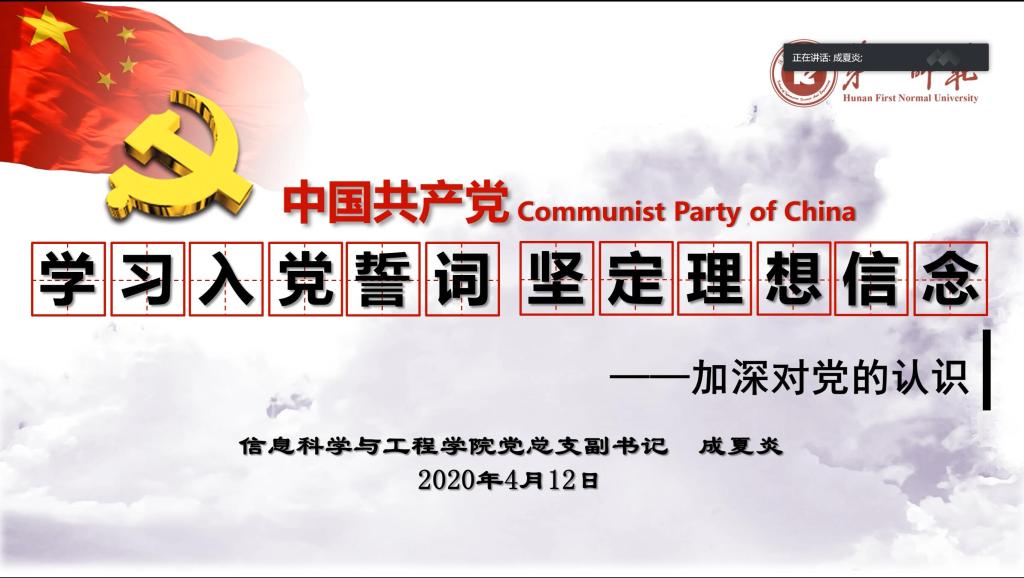 (通讯员 蒋郑菊 邓世骄)4月12日19时,今年会党总支副书记成夏炎通过腾讯会议平台,以“学习入党誓词,坚定理想信念——加深对党的认识”为主题,为今年会分党校和数学与计算科学学院分党校联合举办的第二十四期入党积极分子培训班的学员上党课。