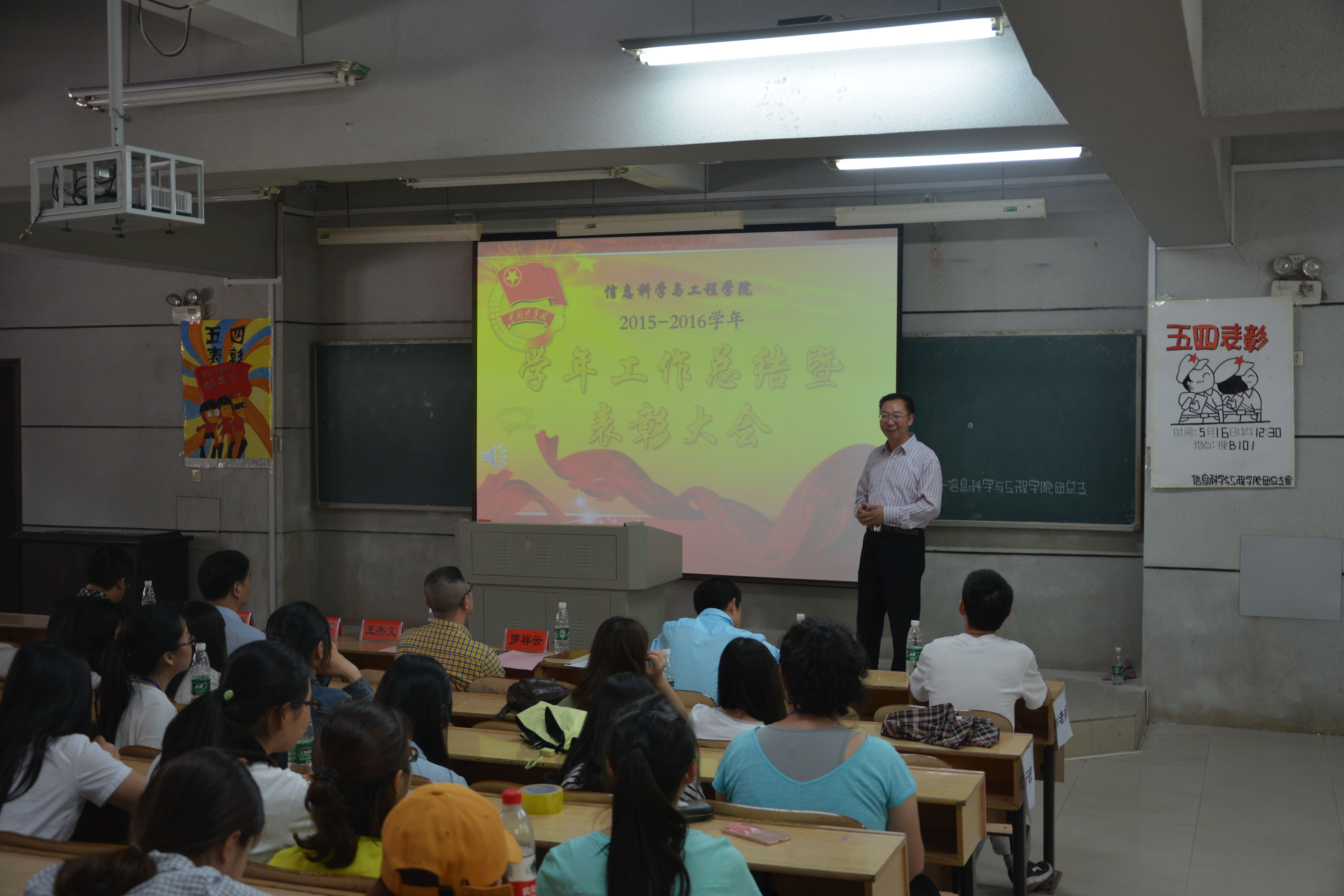 (通讯员 肖亚丽) 5月16日中午,信息科学与工程学院团总支2015-2016学年工作总结暨表彰大会在理科楼B栋101教室隆重举行。信息科学与工程学院党总支王杰文书记、副院长田祖伟教授、副院长王建军博士、党总支罗祥云副书记出席会议。学院全体学生干部及各年级团员青年代表共计300余人参加了本次大会。大会由学工办关红儒老师主持。