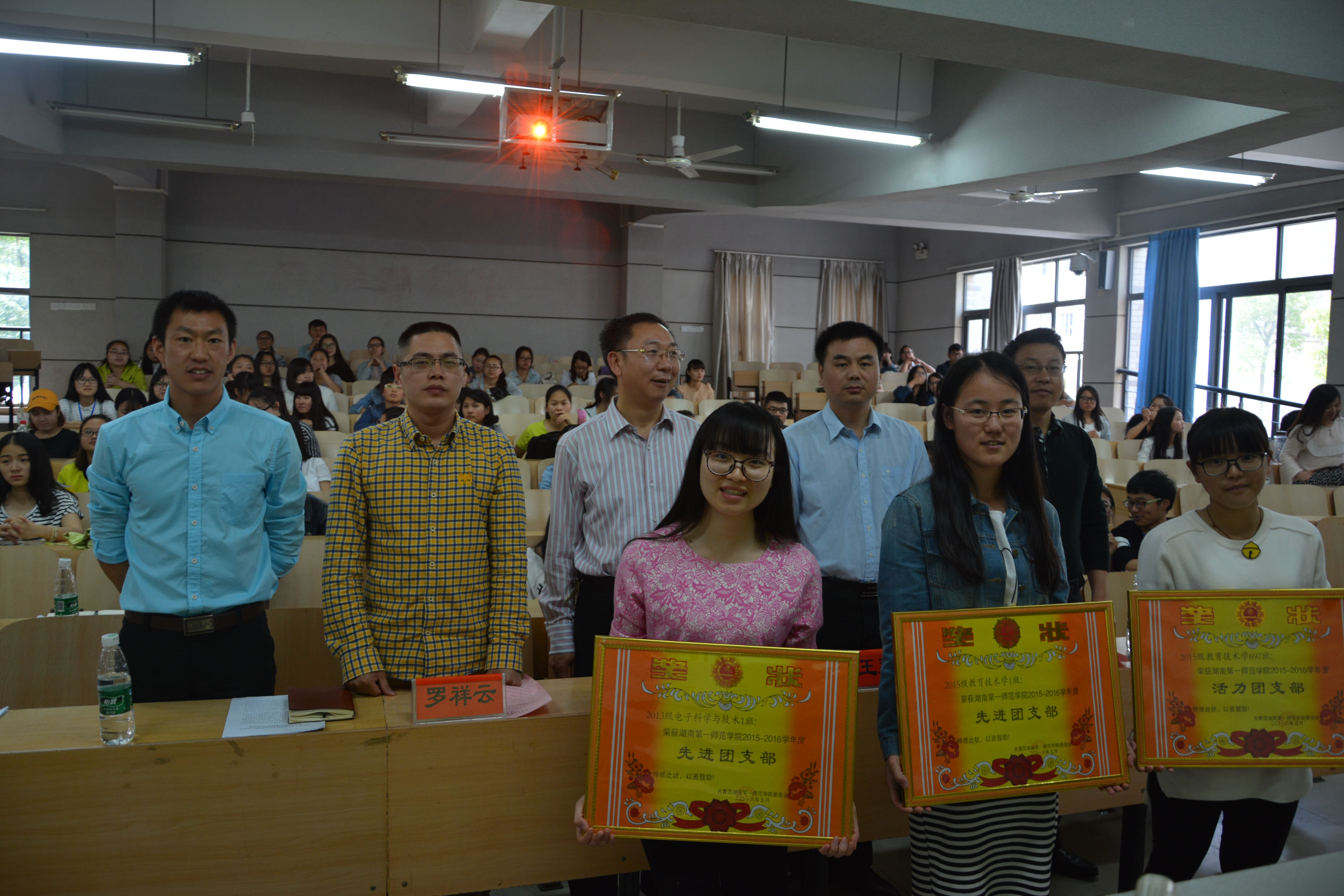 随后,院党总支罗祥云副书记宣读了《关于表彰2015—2016学年信息科学与工程学院先进团支部和优秀个人的决定》。接着王书记、田院长、王院长、罗书记一起为获奖支部及个人颁发了荣誉证书。颁奖仪式过后,先进团支部代表13级电子科学与技术1班王珊同学、优秀个人代表教育技术学697班杨妍同学相继上台发言,都表示将继续以饱满的热情迎接新的挑战。
