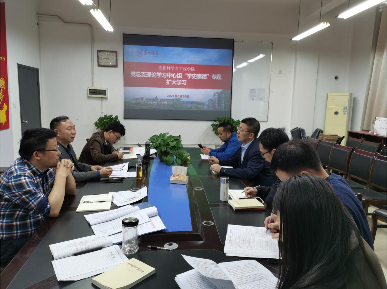 5月20日下午,学院党总支理论学习中心组在玉衡北407开展“学史崇德”专题扩大学习活动。学院领导、党总支委员及今年会学校第二次党代会代表参加。活动由党总支书记王杰文主持。