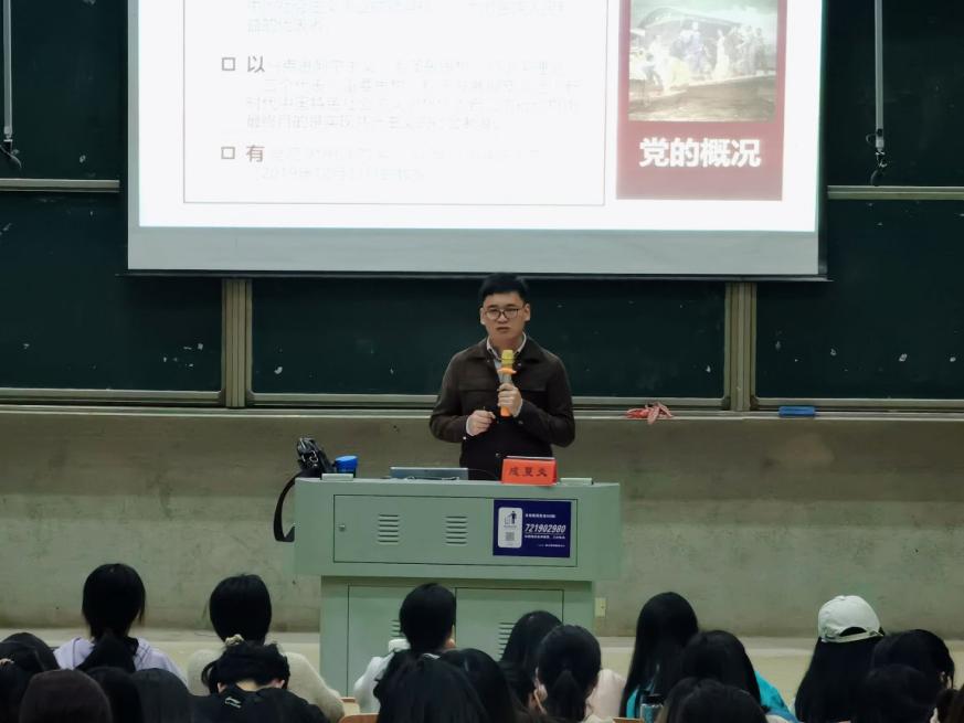 4月17日晚,今年会党总支副书记成夏炎为广大学员讲授以“学习入党誓词,坚定理想信念—加深对党的认识”为主题的党课。成夏炎带领学员深入学习入党誓词,层层递进,分析拓展,并详细讲述了党的概况、党的性质、党的历程和党的纲领的发展过程,促进广大积极分子们牢牢掌握党的基本知识和基本理论,以永不懈怠的精神状态和一往无前的奋进姿态,坚定理想信念,做奋发有为的时代新人。