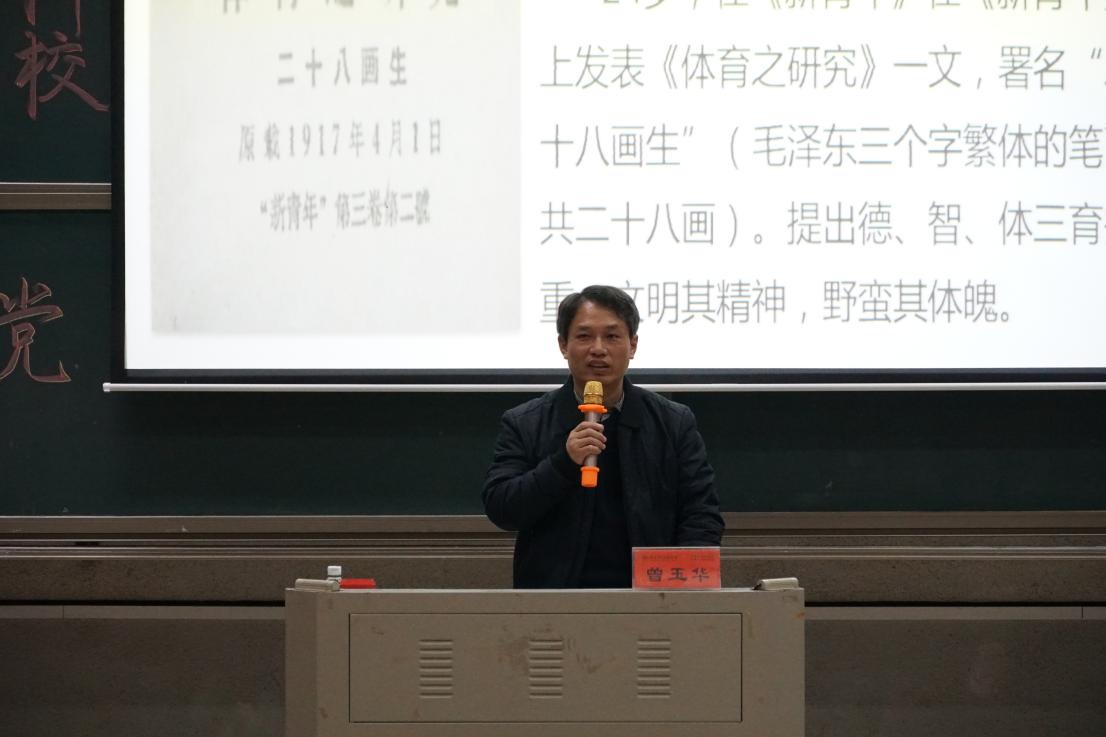 4月20日,学校档案与校史馆馆长刘立勇讲授了以“勤学、修德、明辨、笃实—坚定理想信念、争当有志有为大学生”为主题的党课,带领大家以湖湘文化为例,追忆湖湘伟人、一师伟人,学习他们“立奇志、交奇友、读奇书、创奇事”的感人事迹和崇高精神,号召学员们不忘初心,做奋斗者,继续前行,做实干家。