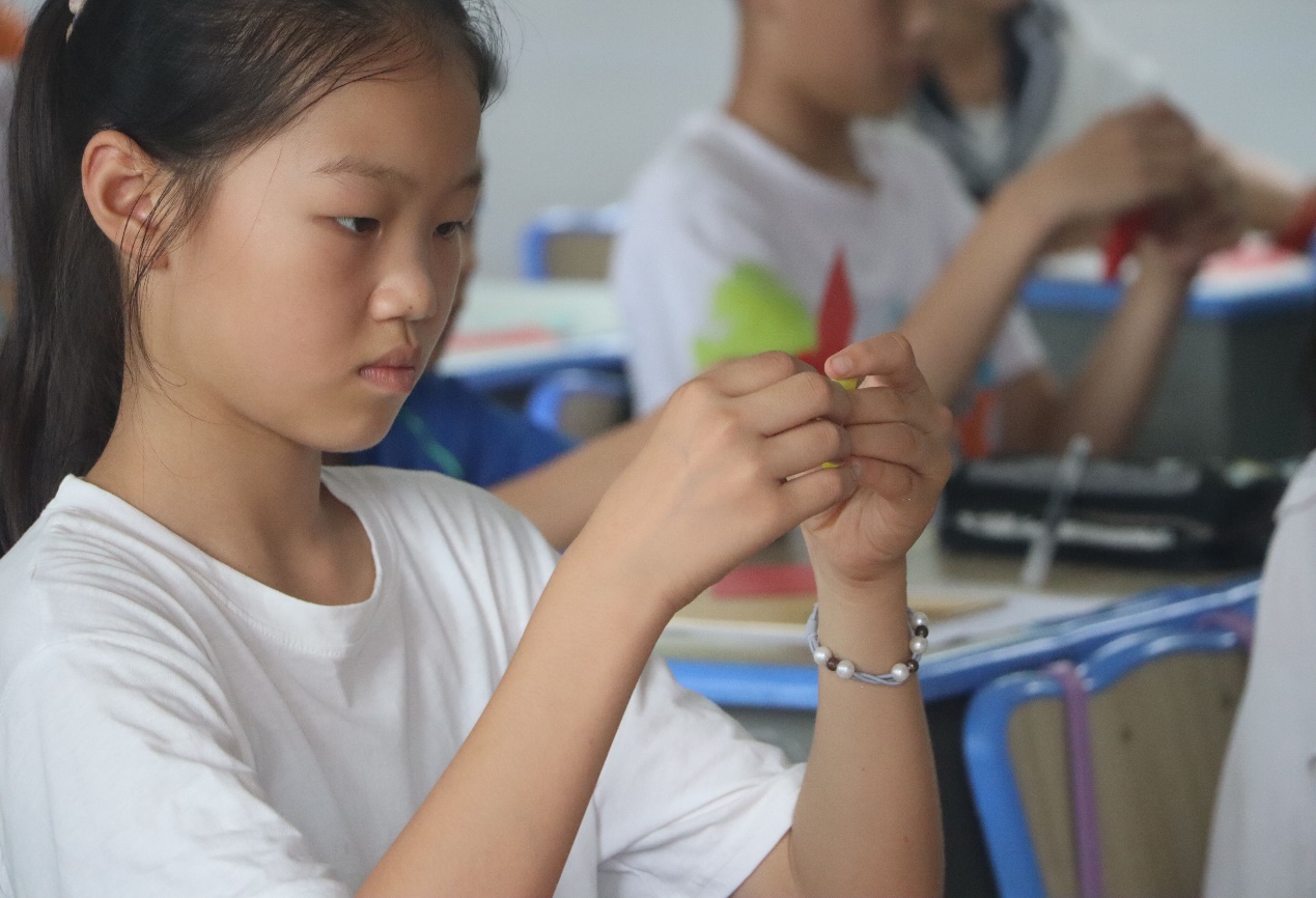 图为“红心向党”趣味手工课上,小朋友们正在认真折红心,红色卡纸在孩子的手里变成一个个红心。通讯员 马唯一 摄