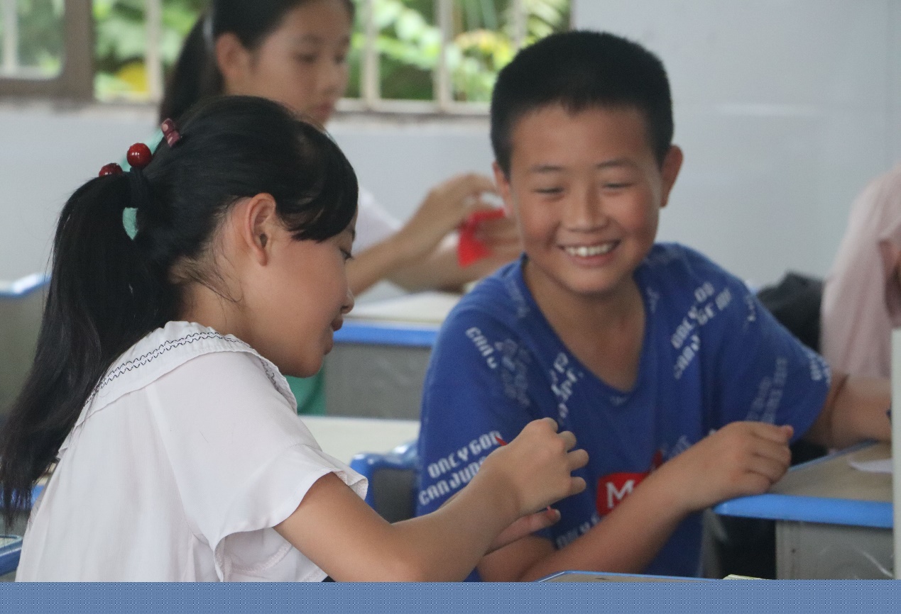图为“红心向党”趣味手工课上,小朋们探头给旁边的人示范红心折纸步骤,旁边的小朋们腼腆的笑着。通讯员 欧阳健 摄