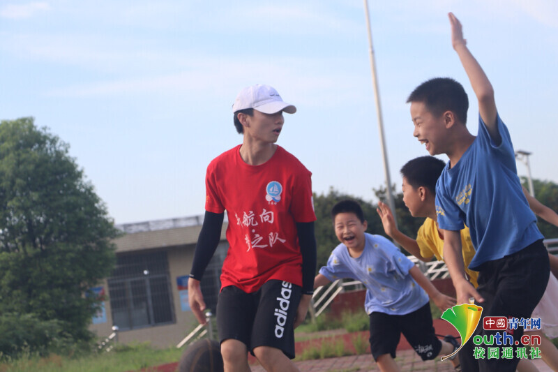 图为体育课上新航向·梦之队志愿者与“七彩假期”公益暑托班的孩子们分享课余生活。中国青年网通讯员 何星逸 摄