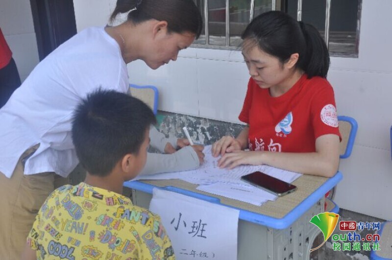 图为家长陪同学生在小班报名负责人处报到入学。中国青年网通讯员 欧阳健 摄