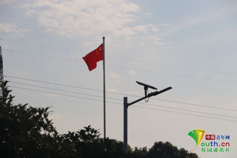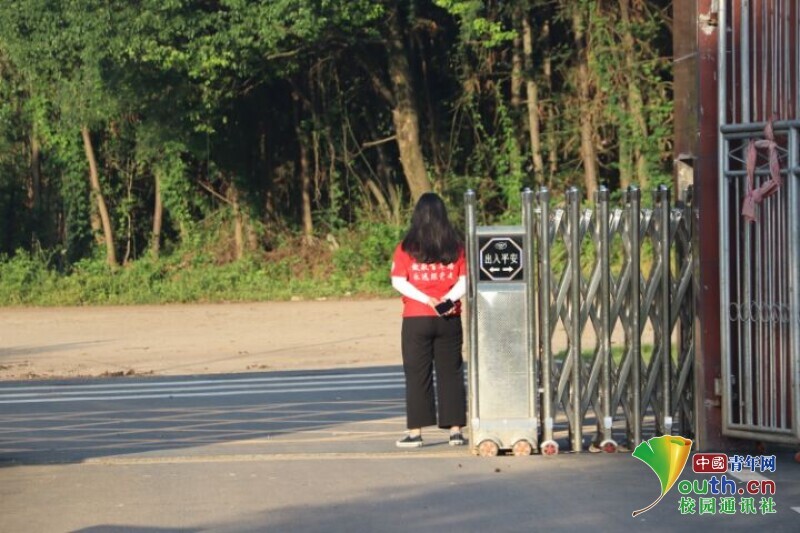 图为新航向•梦之队队员起床洗漱后在校门口期待学生来报道的背影。中国青年网通讯员欧阳健 摄