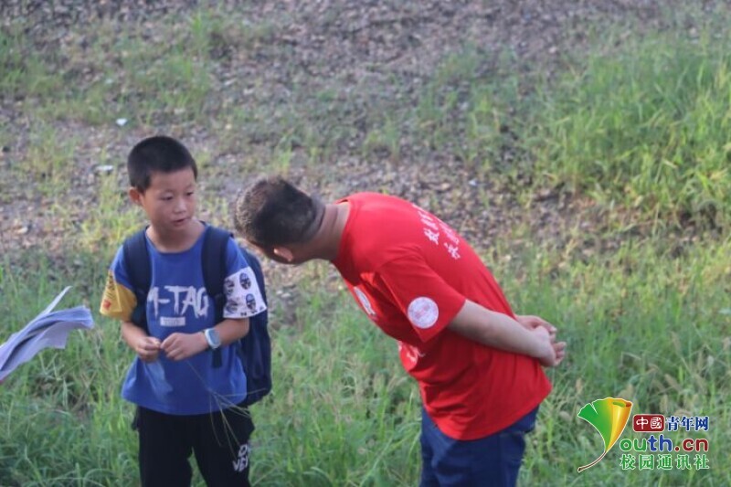 图为新航向•梦之队队员正在弯腰与学生沟通,希望能与学生建立沟通的桥梁。中国青年网通讯员段新利 摄
