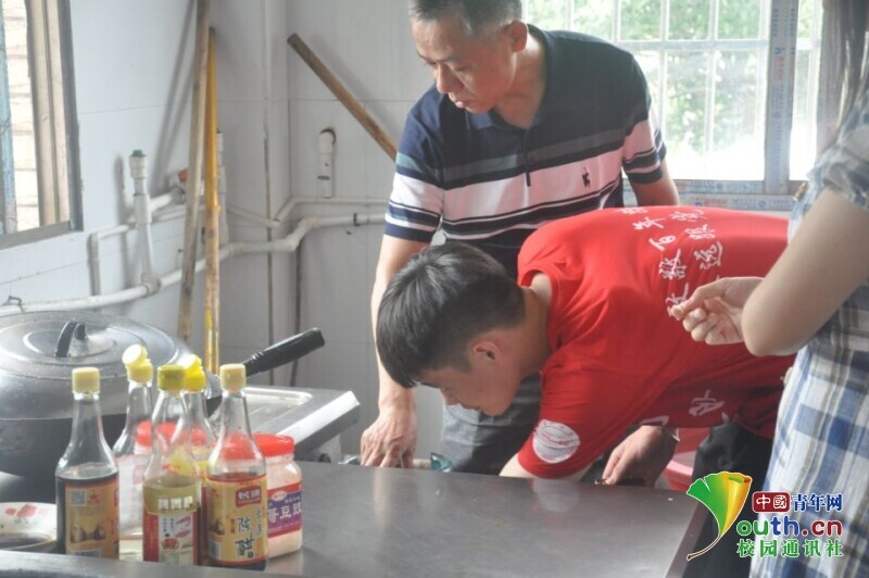 图为学校领导到食堂给队员指导煤气灶及厨房用具的适用方法。中国青年网通讯员 马唯一 摄
