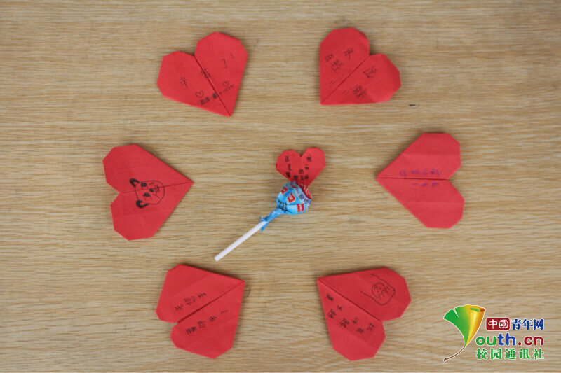 图为小朋友们将自己折的红心和糖果送给老师,红心和糖果进行合影留念。中国青年网通讯员 段新利 摄