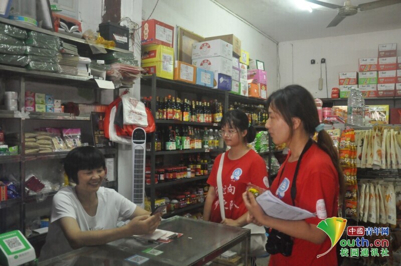 图为新航向·梦之队志愿者向超市阿姨发放调查问卷,介绍国家大学生资助政策。中国青年网通讯员 段新利 摄