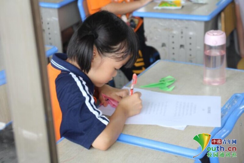 图为手工折纸课上,一个女生在折纸上写下老师的名字,决定下课后送给老师,表达对老师的喜爱。中国青年网通讯员 马唯一 摄