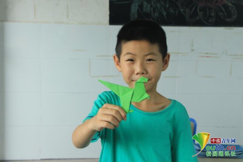 图为孩子高兴地向镜头展示课堂上完成的手工作品。中国青年网通讯员 何星逸 摄