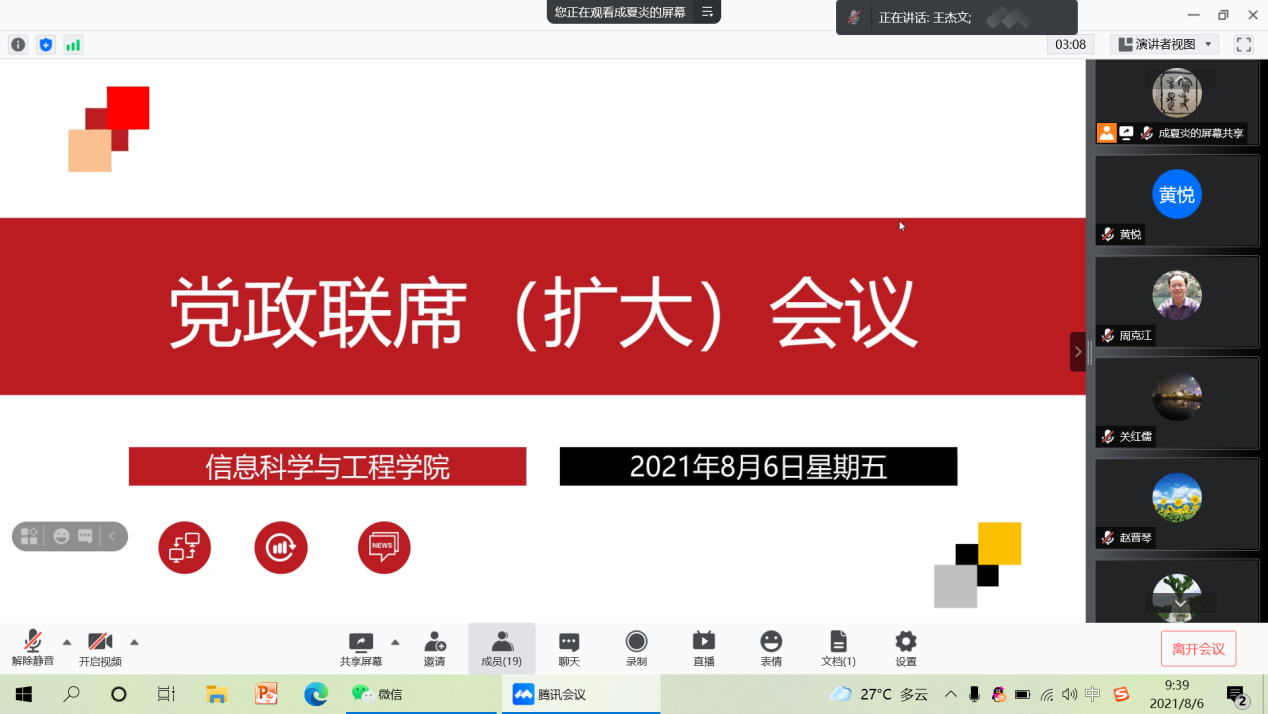8月6日上午,今年会通过腾讯会议平台召开党了政联席(扩大)会议。会议由党总支书记王杰文主持,学院领导及班子成员、党总支组织员、三办主任、党支部书记、教研室主任及实验室主任参加。