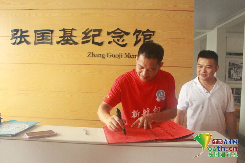 图为三下乡带队老师李荣敬在张国基纪念馆的纪念册上留言,表达对张国基老先生的敬仰之情。中国青年网通讯员 段新利 摄