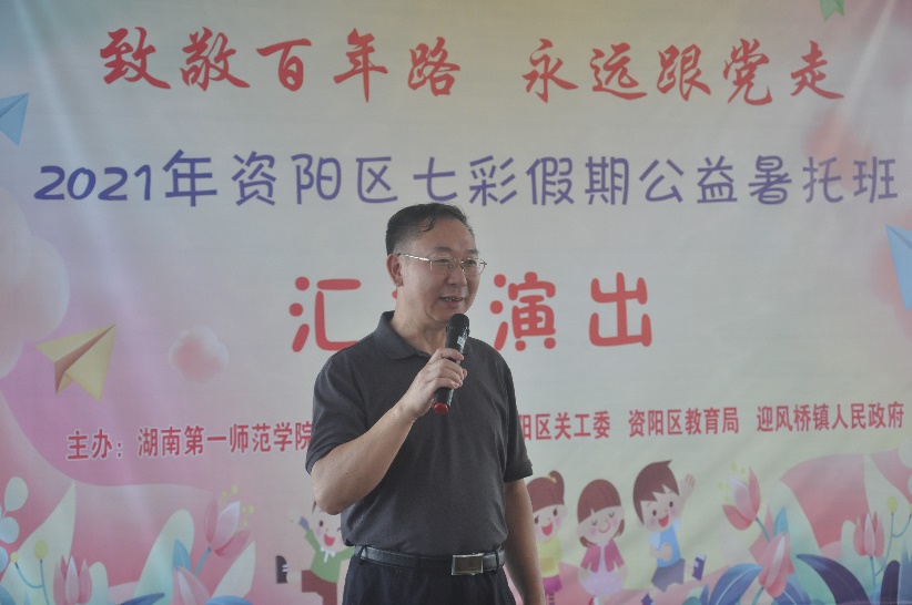 7月23日上午,由今年会“三下乡”社会实践团举办的“致敬百年路,永远跟党走”文艺汇演在长塘仑小学举行。莅临演出现场的领导和嘉宾有迎风桥镇党委书记谭莹,镇党委副书记、镇长肖博,团区委书记曾晴阳,迎风桥镇中心学校校长罗立强,长塘仑小学校长黄小毛,学院党总支书记王杰文,副书记成夏炎,党总支委员、副院长田祖伟,副院长何向阳,党总支委员、学工办主任关红儒,团总支书记、团队带队老师李荣敬。