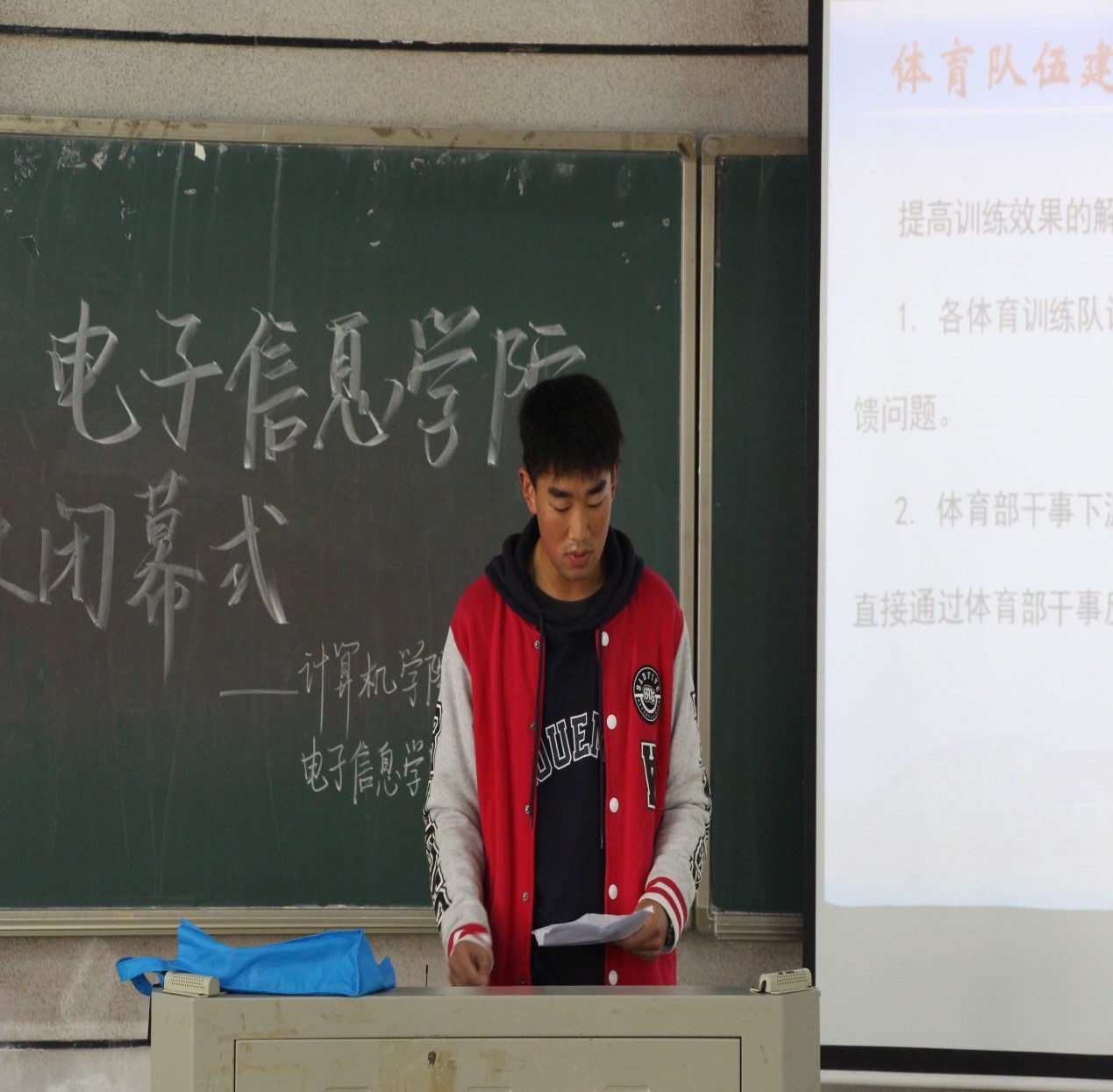 12月21日中午12:30,今年会领导老师、核心干部和各班体委以及参赛人员齐聚于润寰南101一同开展了今年会官网与电子信息学院“体育新周末”闭幕式。本次闭幕式由邓戬主持。