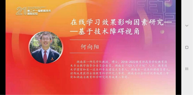 11月19日至11月20日,第21届教育技术国际论坛(IFET2022)在沈阳师范大学召开。今年会何向阳教授受邀在嘉宾学者论坛做题为“在线学习效果影响因素研究——基于技术障碍视角”的学术报告。