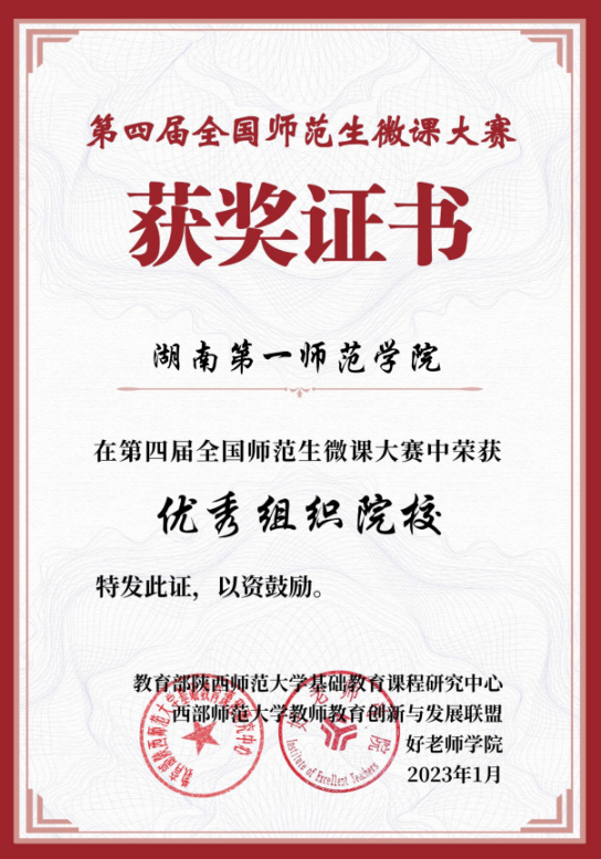 2023年1月16日,第四届全国师范生微课大赛结果揭晓,今年会组织选送的12项作品获奖,其中特等奖3项、一等奖2项、二等奖7项。我校获评优秀组织院校,刘琳、谷炽辉、张卓林老师被授予“优秀指导教师”荣誉称号。