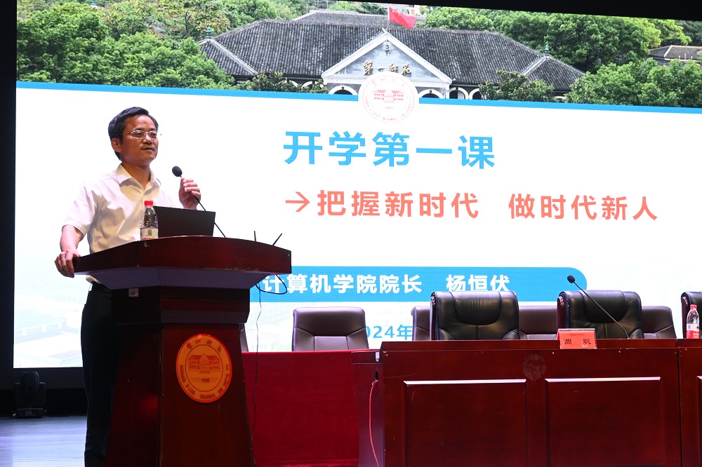 最后,杨恒伏以“把握新时代,做时代新人”为题为新生带来了开学第一课。他从学校学院概况、新时代的我们、我们不一样三个方面进行讲述。杨恒伏首先介绍了学校发展历程和学院概况,通过分析数据化时代及人工智能AI的影响,指出新形势对当代大学生提出了新要求,面对新要求如何取得新作为。他以“我们必须不一样,我们要有代表作”寄语同学们拥抱数字时代,勇担新时代的开拓者和追梦人。