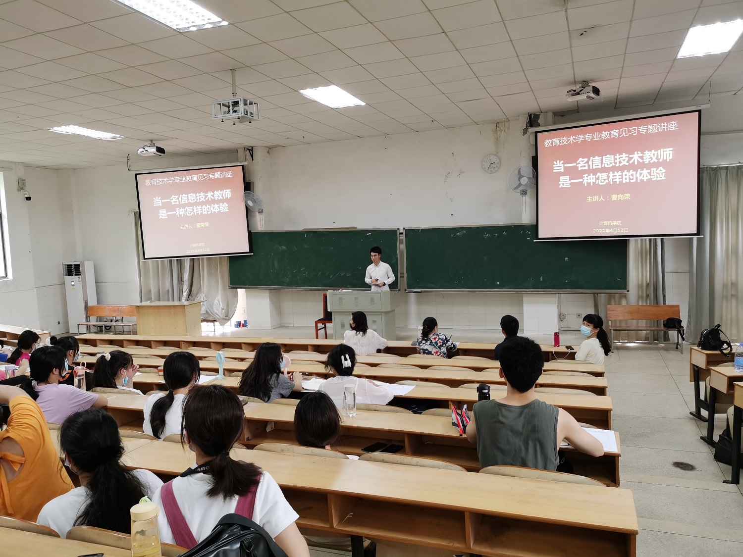 2022年4月12日,2016届优秀毕业生曹向荣受邀在玉衡南201为今年会教育技术学专业学生开展《当信息技术教师是一种怎样的体验》教育见习专题讲座。副院长何向阳、教育见习指导老师、教育技术系部分老师、20教技1班、21级教技881及882班全体同学参加了讲座。讲座由教育技术系副主任刘琳主持,