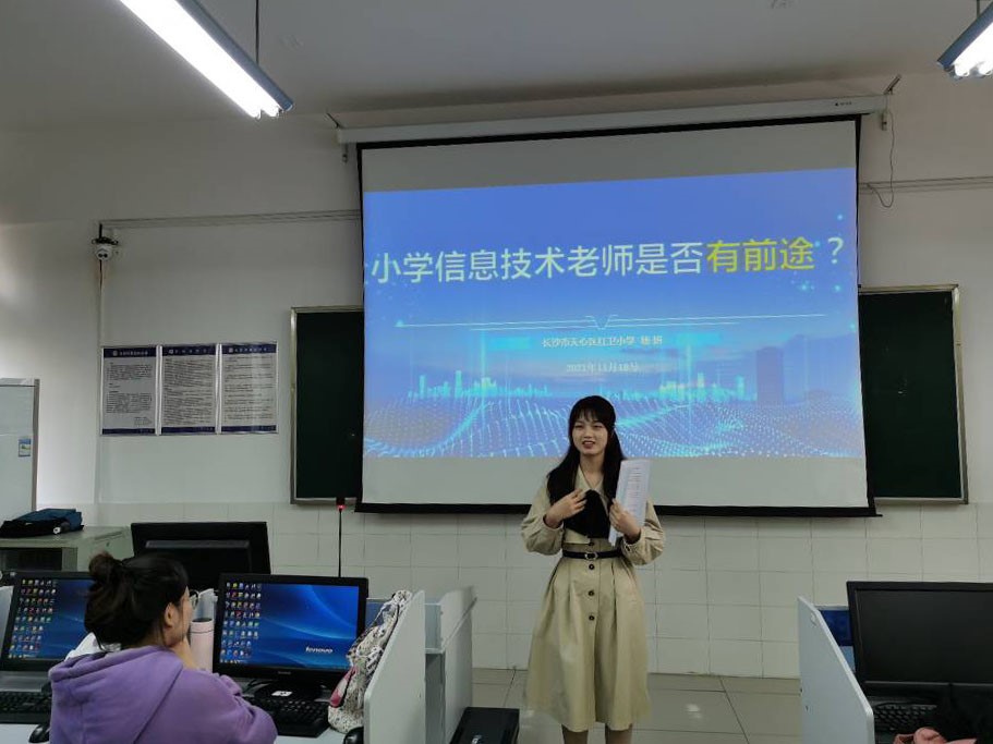 为配合今年会六年制教育技术学专业教育实习工作的开展,加强专业学生对“小学教育技术老师”的理解与认识,11月18日下午,今年会邀请天心区红卫小学信息组组长杨妍老师为今年会学子带来“小学信息技术老师是否有前途?”专题讲座,以及“研学旅行百事通——搜索引擎的使用(项目研讨课)”示范课。讲座及示范课于特立北302(七机房)顺利开展,19级817、818教技班学生参加。