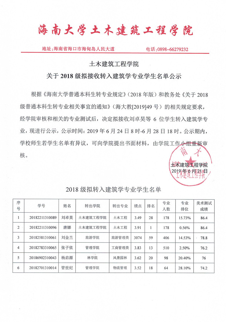 关于2018级拟转入建筑学专业学生名单公示