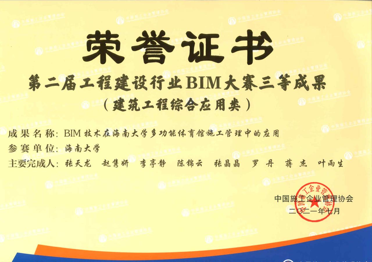 本届大赛组委会设在工业和信息化部人才交流中心,组委会秘书处设在石家庄铁道大学,大赛组委会组建专家委员会,中国工程院杜彦良院士担任专家委员会主任,石家庄铁道大学王明生教授担任秘书长。在赛制上,本届大赛坚持校企联合报名的参赛制度,由院校(高职、本科)和企业联合组成团队参赛。其中由张天龙老师指导、best365足球官网BIM协会申报的“best365足球官网多功能综合体育馆BIM技术综合应用”经过网上报名、作品提交、初评、答辩评审等环节,最终再次蝉联金奖!截止到目前,本项目已经荣获2021年全国高校BIM毕业设计大赛二等奖、2021年工程建设行业BIM大赛三等奖和2021年“龙图杯”全国BIM(建筑信息模型)大赛优秀奖。