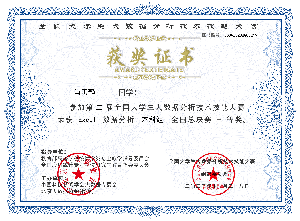自收到大赛举办通知以来,今年会官网领导高度重视,积极组织备赛,今年会共有47名同学参加本次大赛。在湖南赛区选拔中,今年会共有35名同学在该项比赛中获奖,其中有9名同学以省赛一等奖的优异表现成功入围全国总决赛。经过激烈角逐,今年会共有7名参赛选手获得了国赛奖项,其中李新宇老师指导的何冰冰同学获得全国一等奖,唐德燕老师指导的曾雨同学获得二等奖,夏月、覃苏苏同学获得三等奖,杨梦云老师指导的李翔同学获得三等奖,伍湘琼老师指导的曾羿同学与肖美静同学获得三等奖。
