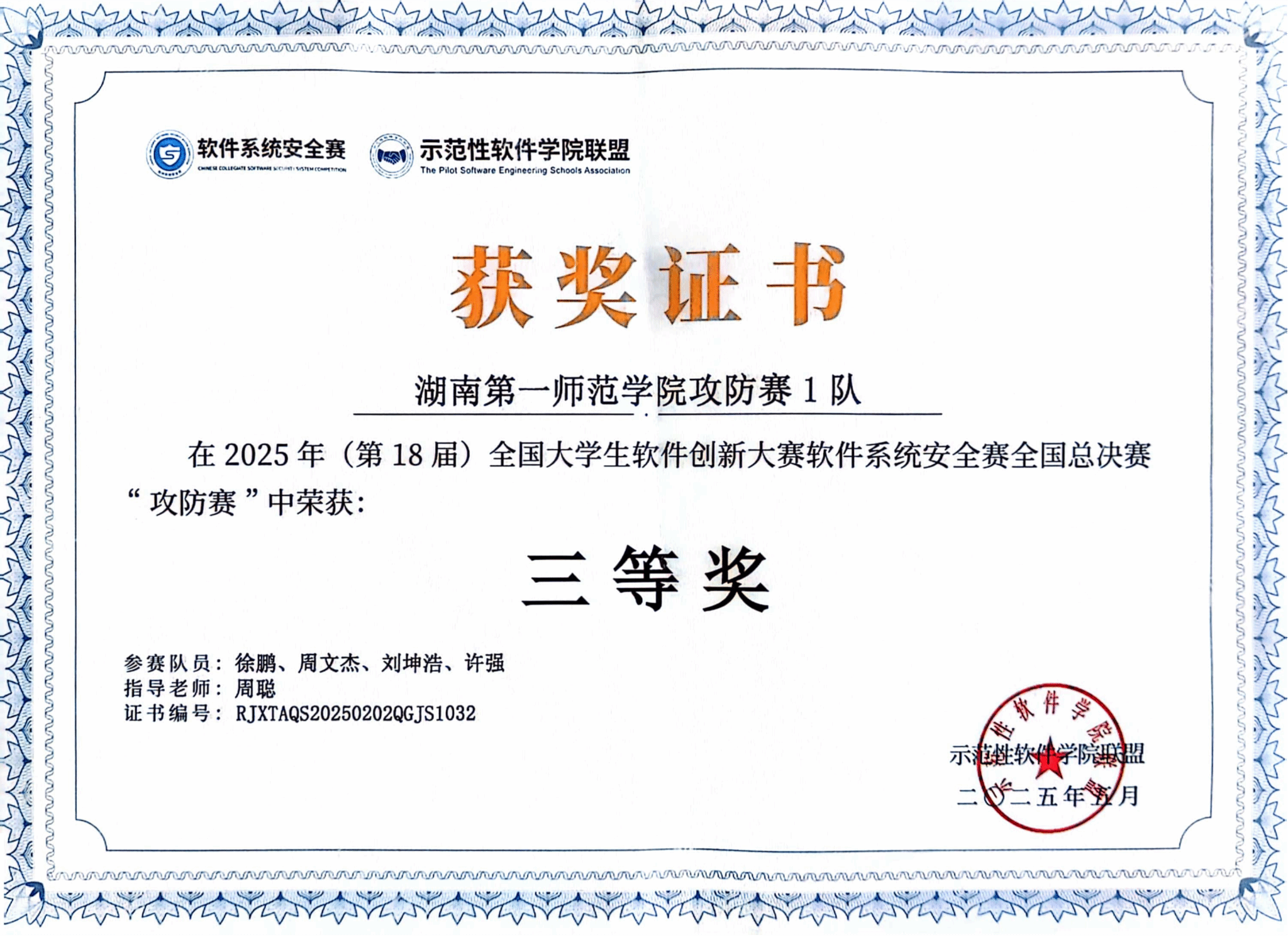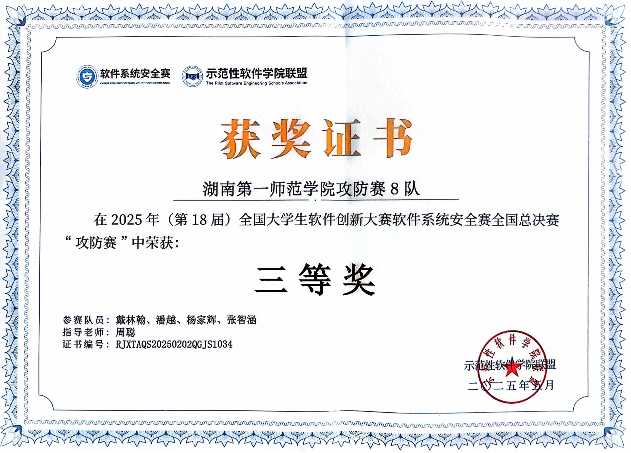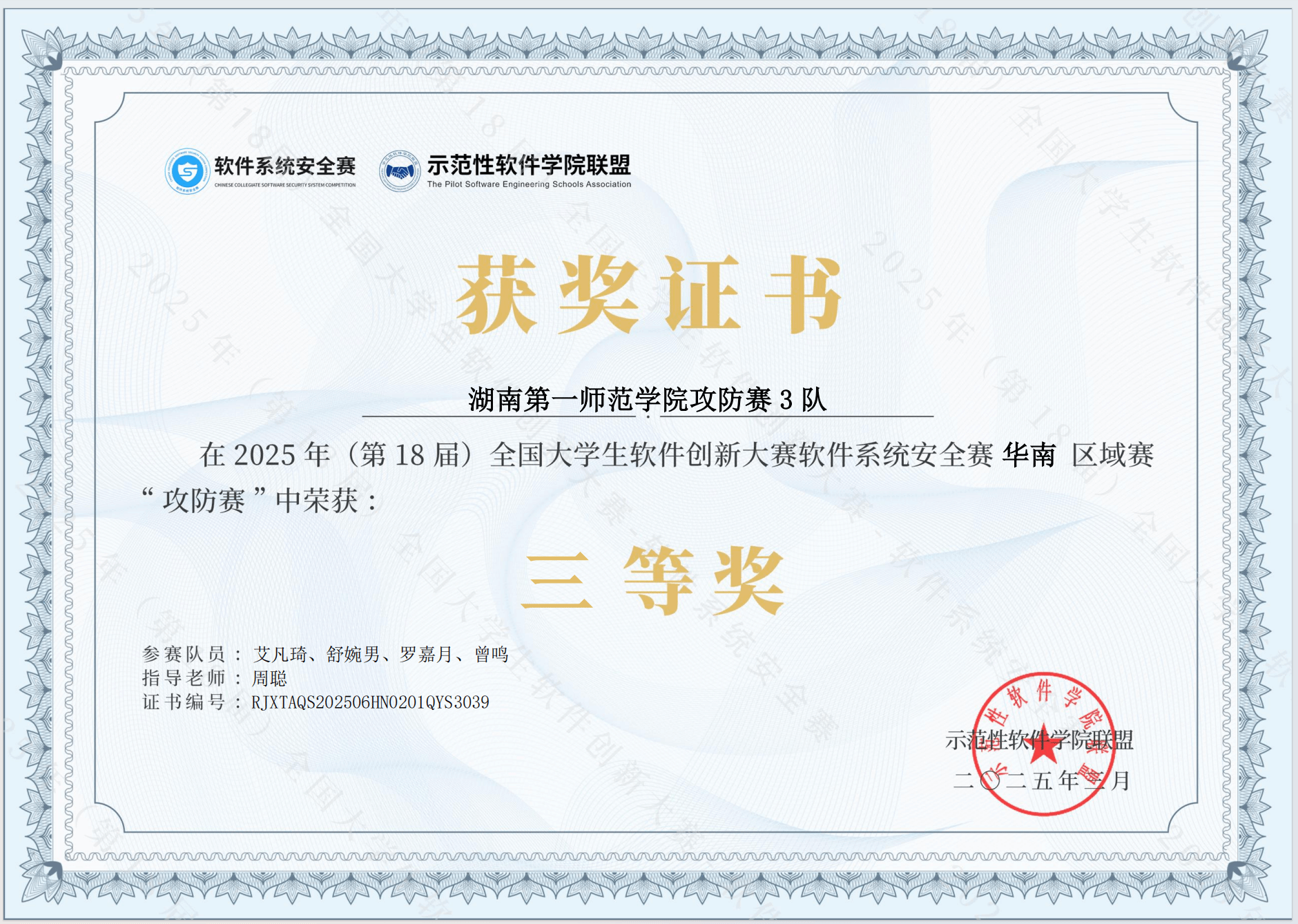 第18届全国大学生软件创新大赛软件系统安全赛全国总决赛于2025年5月18日在湖南大学圆满落幕。湖南高校共有18支团队获奖。其中我院的2支参赛团队荣获攻防赛三等奖,实现了网安竞赛团队在国家级赛事中获奖的突破。在区域赛阶段,今年会参赛团队表现出色,斩获一等奖2项、二等奖1项、三等奖3项,位居华南赛区前列。