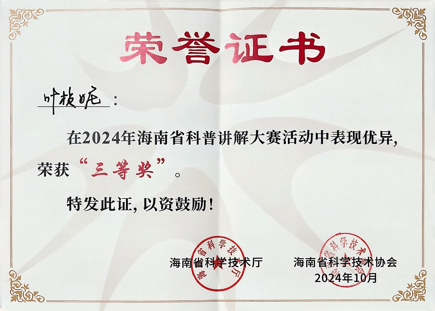 在刚刚落幕的2024年海南省科普讲解大赛中,best365足球官网土木与建筑工程学院叶桢妮副教授以出色的表现获得三等奖,为best365争得了荣誉。本次大赛以“弘扬科学家精神 激发全社会创新活力”为主题,吸引了全省各行各业的143名选手参与。海南省科普讲解大赛是全省科普工作者沟通交流、展示风采的重要平台,也是海南科普活动的一张亮丽名片。自2015年以来,大赛已成功举办十届,参与人数持续上升,活动形式不断创新,活动层次不断提高,已成为目前全省范围最大、水平最高、代表性最强的科普讲解竞赛。