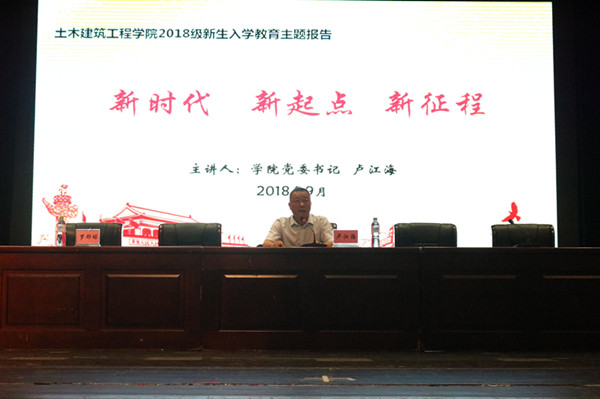 大会第二阶段,学院党委卢江海书记作为主讲人,以“新时代 新起点 新征程”为题为新生开讲入学教育第一课。卢书记以中国特色社会主义进入新时代为起点,鼓励同学们在新时代、新起点要刻苦学习,奋发有为,为实现“两个一百年”奋斗目标挥洒自己的青春和热血。