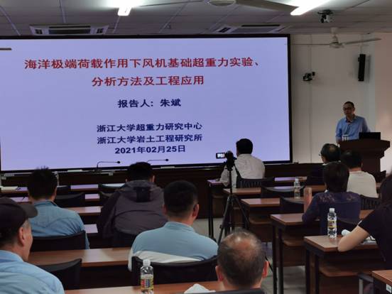朱斌教授作了题为“海洋极端荷载作用下风机基础超重力实验、分析方法及工程应用”的报告,分别从研究背景及思路、超重力模型地基制备及测试方法、海上风机基础超重力实验、典型工程应用等方面分享自己在研究海上风力发电成果及科研心得。