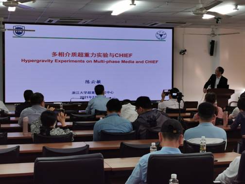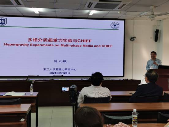 陈云敏院士作了题为“多相介质超重力实验与CHIEF”的报告,分别从重力作用及CHIEF的科学思想、CHIEF的工程背景和设计、超重力实验举例及海洋工程应用等方面分享自己的研究成果。