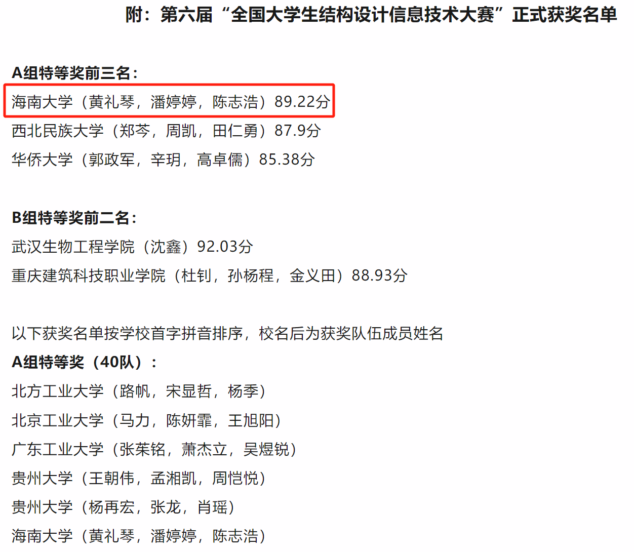 2024年5月20日,经过大赛首次特等奖答辩,第六届“全国大学生结构设计信息技术大赛”正式获奖名单公布,best365学生团队在本次大赛中再创佳绩。荣获特等奖1支队伍,一等奖4支队伍,二等奖1支队伍。值得庆贺的是,由赵菲老师指导的“best365足球官网(黄礼琴,潘婷婷,陈志浩)”团队以89.22的高分荣获全国特等奖第一名!除此之外,赵菲老师还获得了优秀指导老师奖。他们的出色表现不仅为学院赢得了荣誉,更是生动诠释了best365学子追求卓越、不断超越自我的精神面貌,激励着更多学子在未来的征程中不断砥砺前行,创造更加辉煌的成绩。