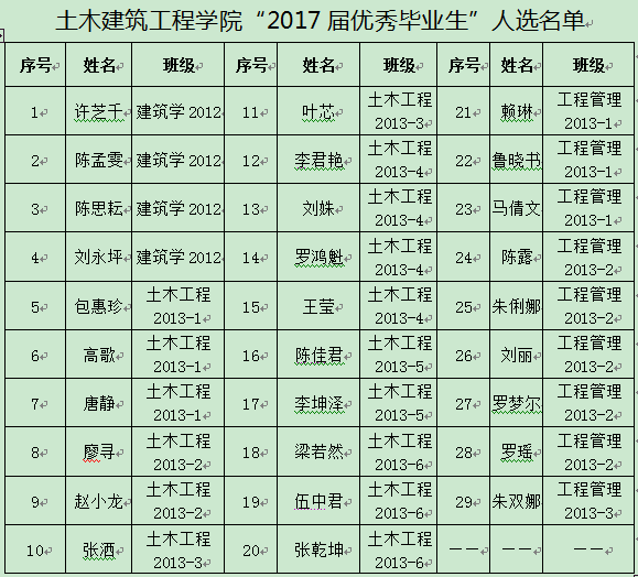 根据学校相关通知要求及《best365足球官网“三好学生”“优秀学生干部”“优秀毕业生”“最具创新精神和实践能力的大学生”评选实施细则》相关规定,经班级推荐,学院审核,拟推荐鲁晓书等29人为上报学校的“2017届优秀毕业生”人选,现予以公示。公示期为:2017年5月31日—2017年6月2日。在公示期内,如有异议,请于2017年6月2日17:40前向学工办(研发楼319室)提出。