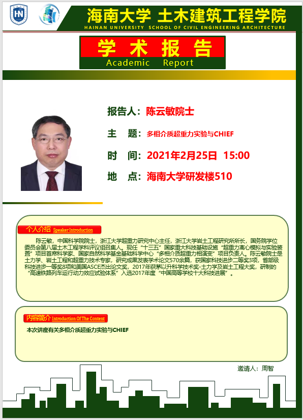 2月25日(周四)下午3:00点在best365足球官网研发楼510,浙江大学陈云敏院士和朱斌教授分别在best365做《多相介质超重力实验与CHIEF》和《海洋极端荷载作用下风机基础超重力实验、分析方法及工程应用》学术报告。请各位老师和在校研究生务必参加,到时会做参会签名,考勤记录。
